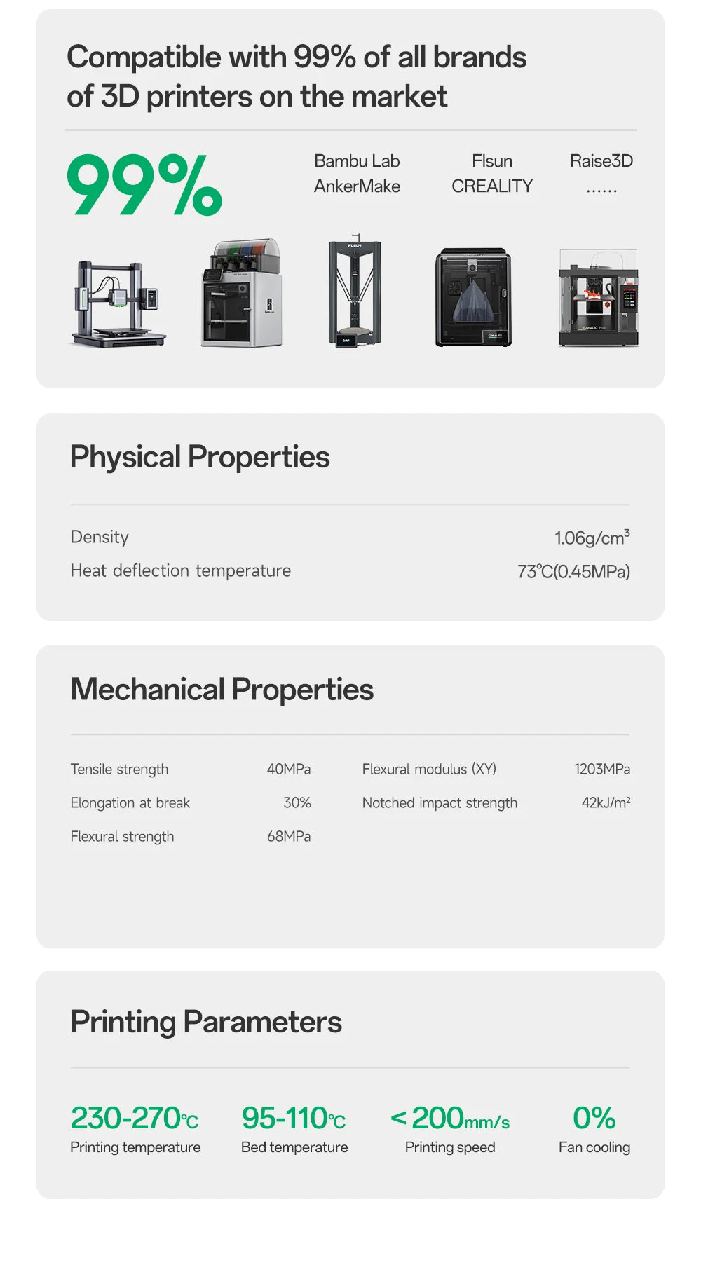 【Recommended Printing Temperature】Printing Temp. at 220-260℃ can give you a smooth prints which require less calibration and give off fewer extruder issues. Use With Heated Build Platform Is Recommended.
