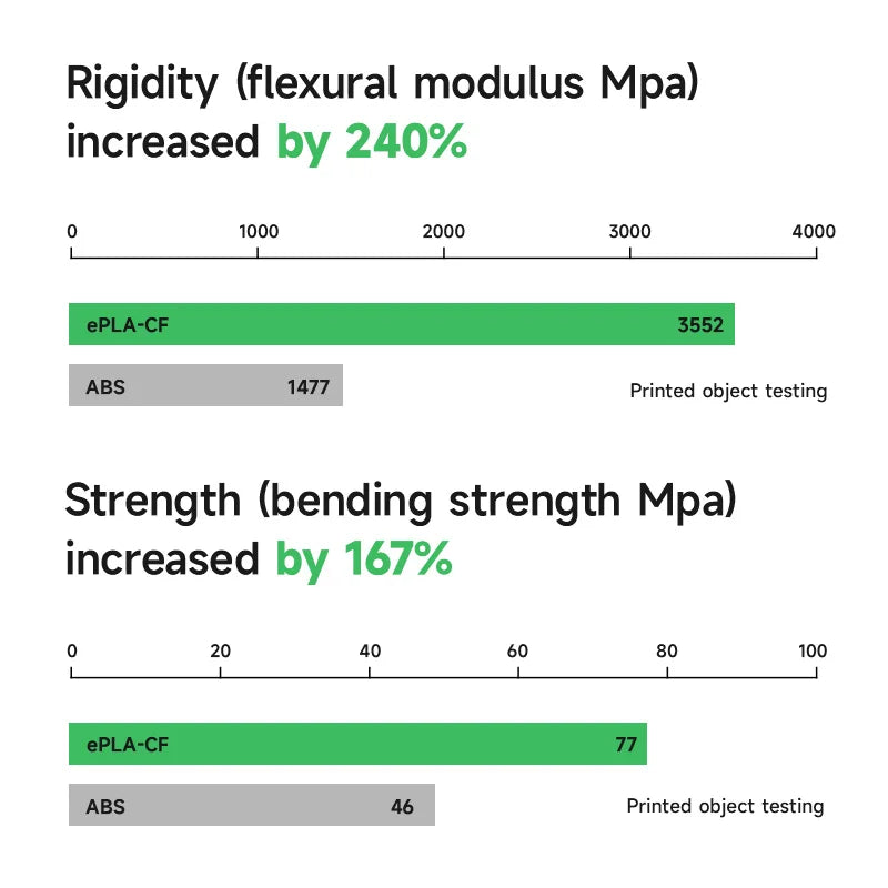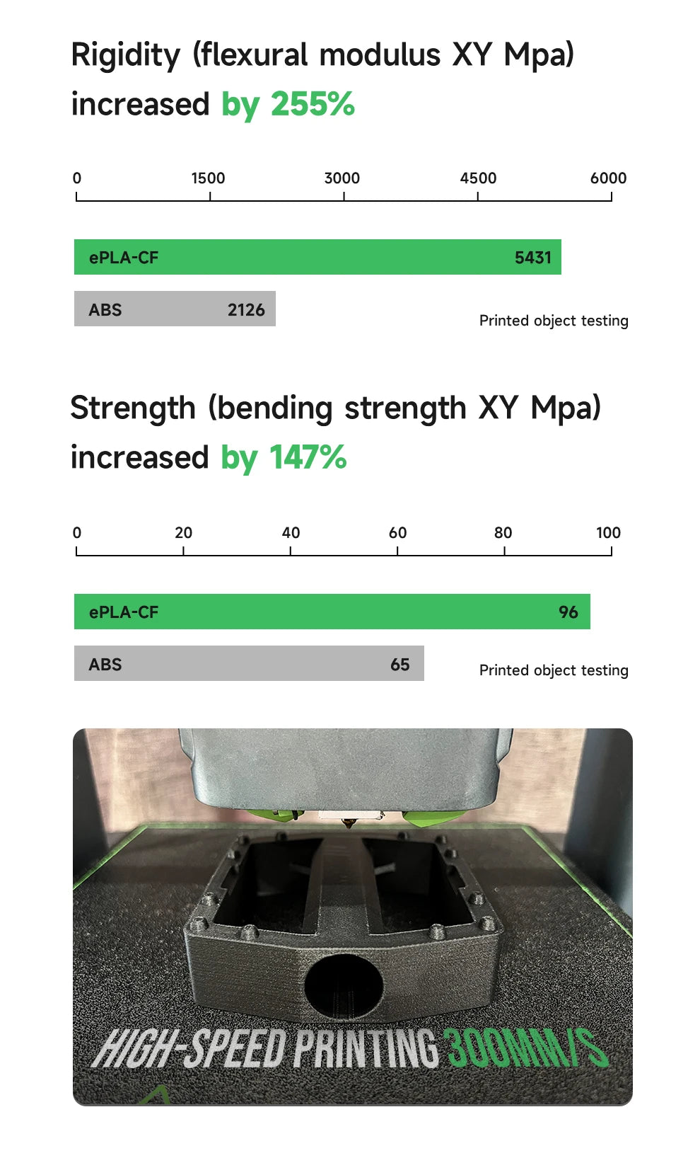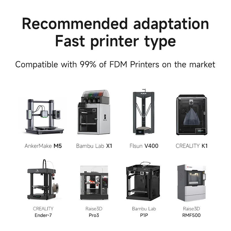 【High Compatibility】: eSUN ePLA-CF is compatible with most of FDM printers, such as Anycubic, Creality and Voron, etc. Well adapted to speedy printing, it is also compatible with high speed printers such as AnkerMake M5, Bambu Lab X1/ P1P, Creality K1/ Ender 7, Flsun V400, Raise3D Pro3/ RMF500, etc.